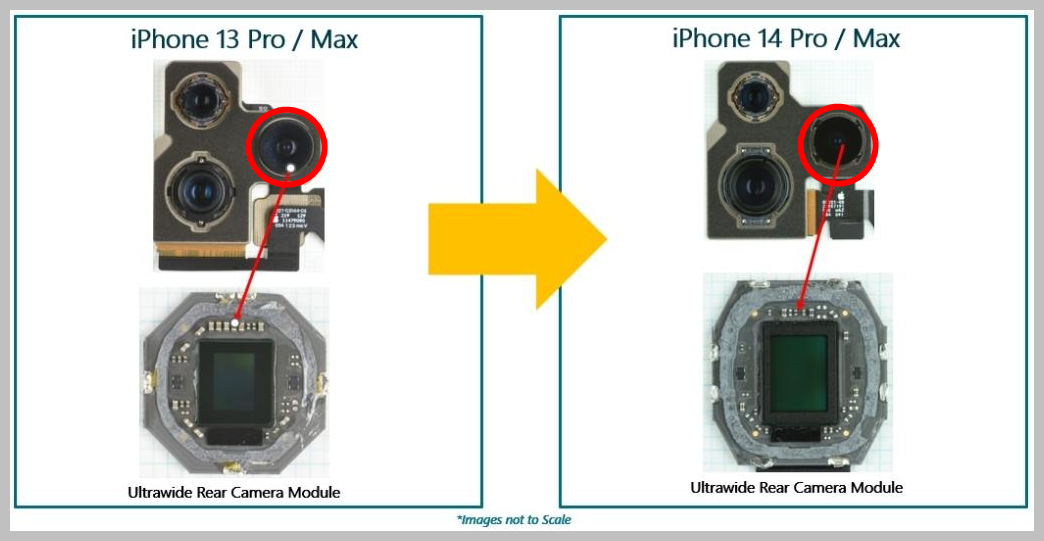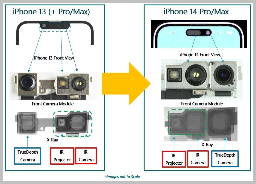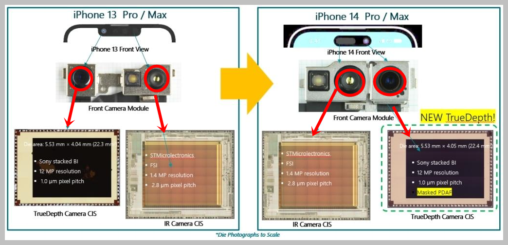 Face ID IR Cam에 사용된 이미지 센서는 iPhone 13과 iPhone 14 모두에서 동일한 1.4MP 픽셀 피치 2.8µm STMicroelectronics Die를 사용합니다. 그러나 Sony TrueDepth 카메라는 위상 검출 자동 초점(PDAF) 기능을 포함하도록 업그레이드되었습니다