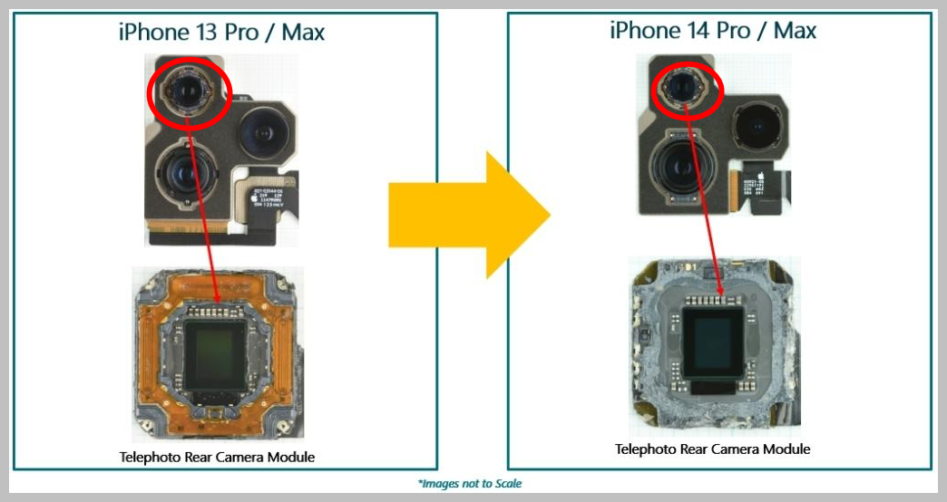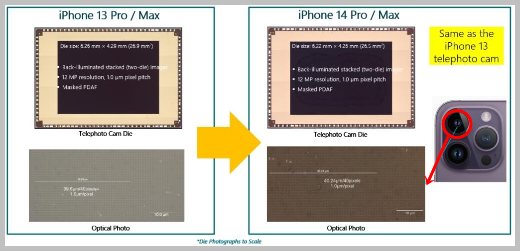 12MP, 1.0µm 픽셀 크기와 마스크드 PDAF를 갖춘 iPhone 14 Pro/Max 망원 카메라는 iPhone 13 Pro/Max 망원 카메라와 동일한 것으로 보입니다